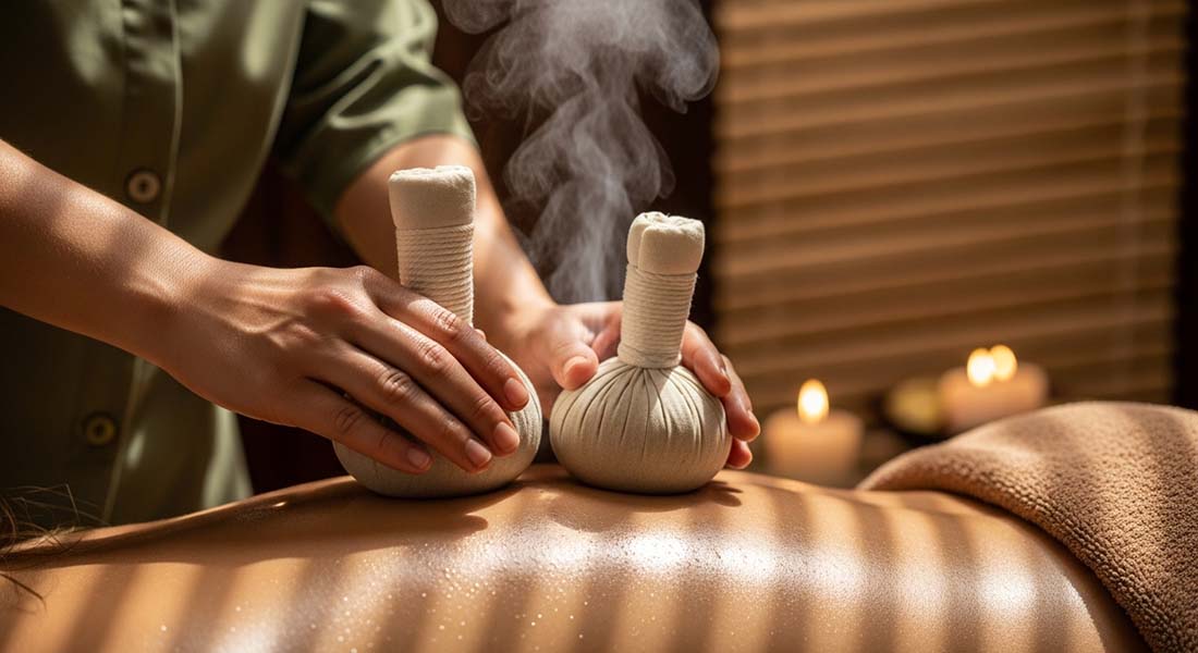 El masaje de pindas calientes combina calor terapéutico y presión suave mediante sacos de tela rellenos con hierbas naturales calentadas, aplicados sobre el cuerpo con movimientos rítmicos y controlados.